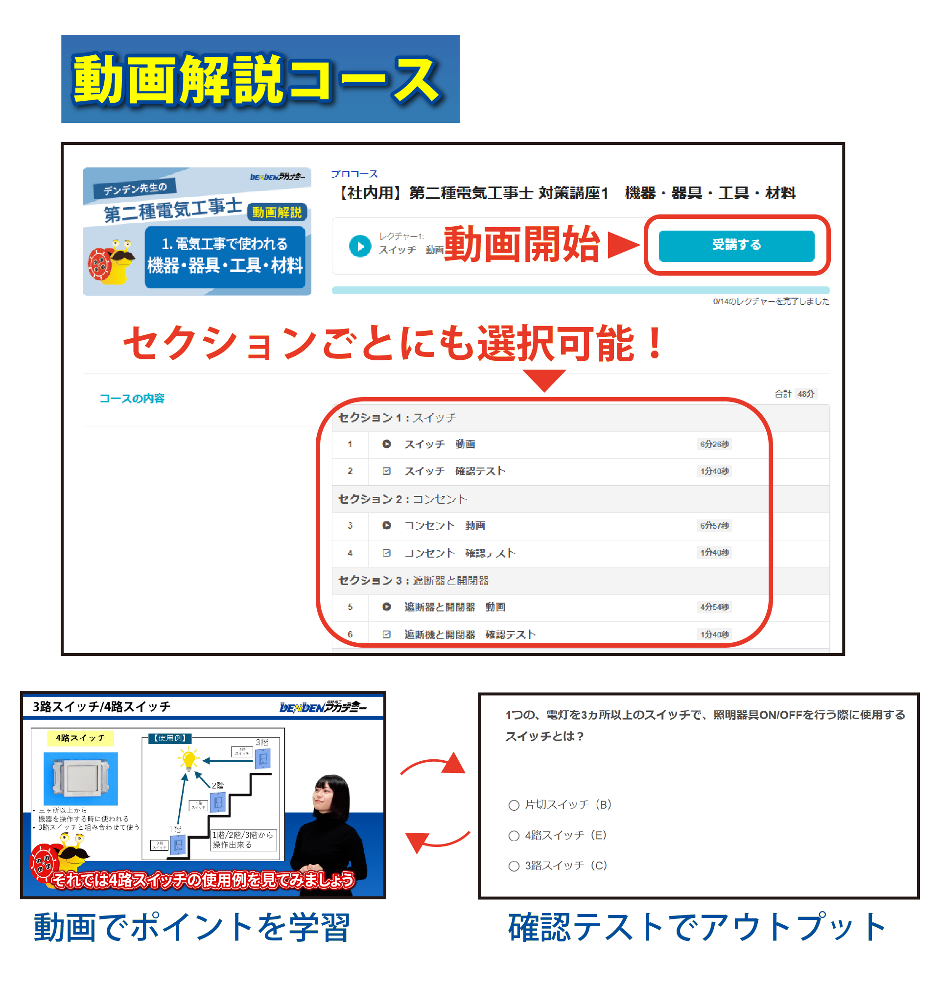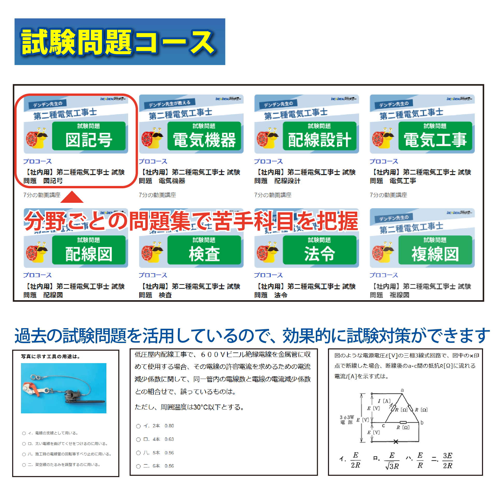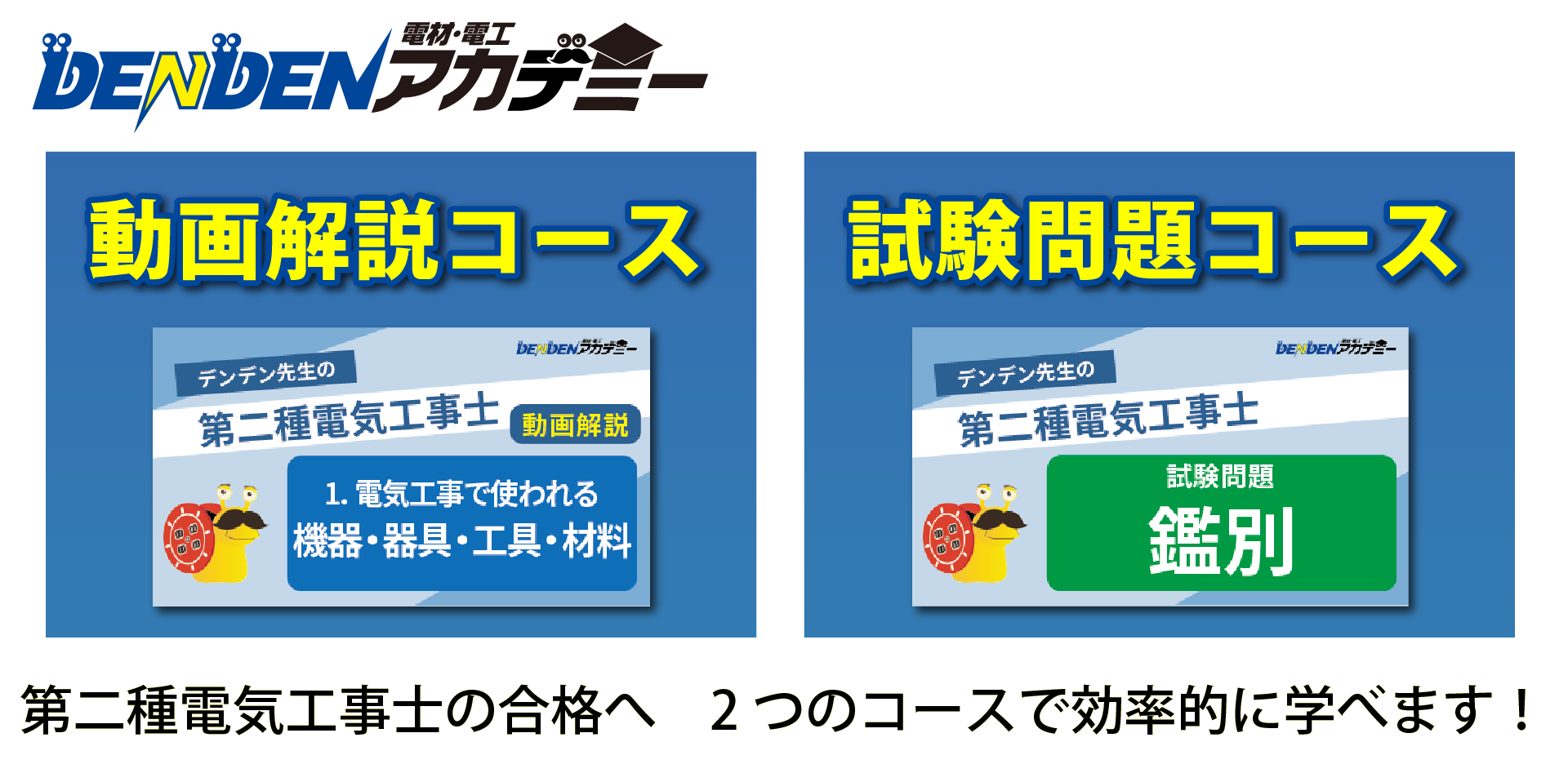 DENDENアカデミーでは、第二種電気工事士の資格取得に向けた学科試験対策として、動画講義と、科目別に整理された問題集をセットにした実践的な学習コースです。